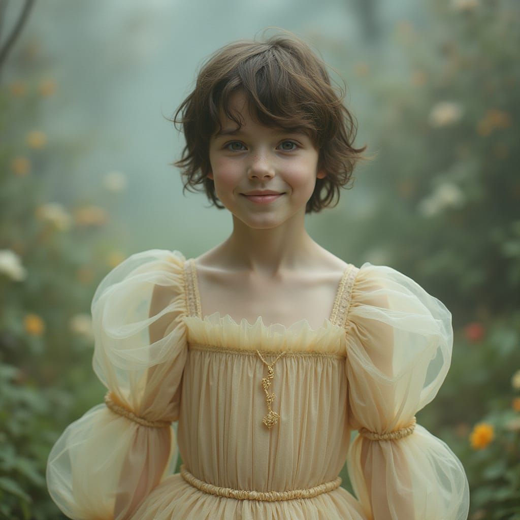 This image depicts a young man in a flowing, sheer organza dress, surrounded by a dreamy, ethereal atmosphere reminiscent of Tim Walker's photography and Sofia Coppola's film style.