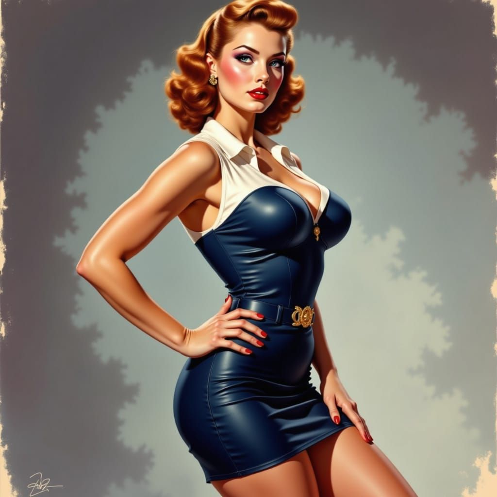 A photorealistic portrait of a curvy 1940s USO performer, showcasing classic Hollywood glamour with meticulous attention to detail, reminiscent of iconic pin-up art from the masters Alberto Vargas, Gil Elvgren, and George Petty.