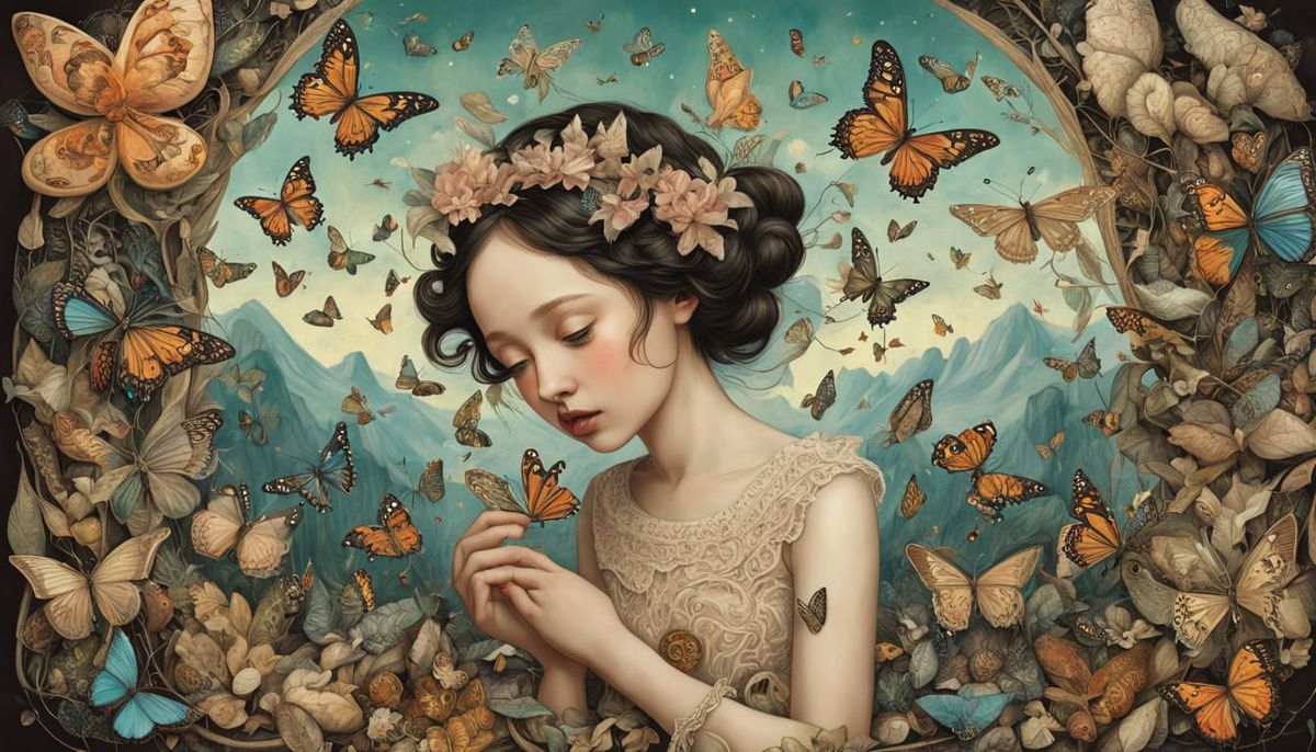 This image shows a vibrant, surrealist collage of a four-stage life cycle, featuring caterpillars, chrysalises, and butterflies, amidst shattered mirror pieces and handmade figurines, conveying the emotional journey of self-discovery and evolution.