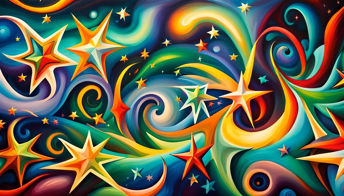 A striking picture of five swirling stars connected by electromagnetic coils, set against a deep, spiraling background of myriad stars. The image employs a naive art style with vivid colors and 3D shading.