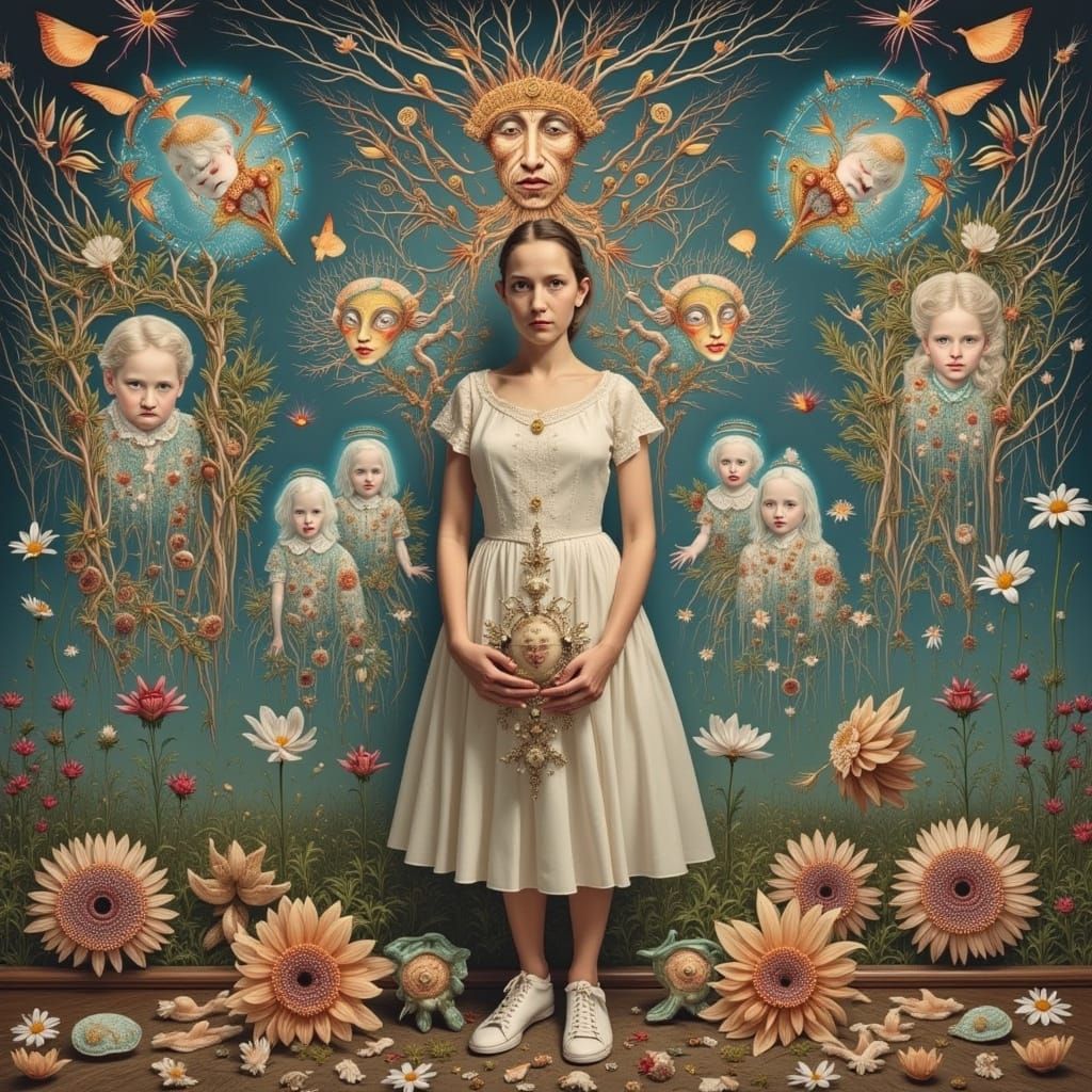 A surreal image of a person amidst family trees and globe fragments. Cracked mirrors and puzzle pieces fill the scene, rendered in vibrant colors and abstract forms. Evokes themes of transformation in a dreamlike atmosphere.