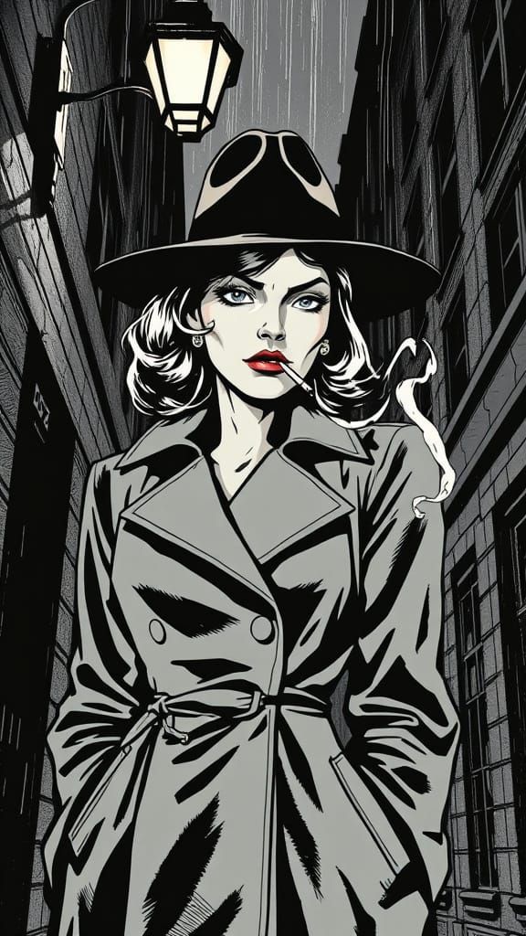 A black and white comic book image of a female detective in a trench coat under a streetlamp. This 1940s-style noir scene features high contrast and dramatic shadows.