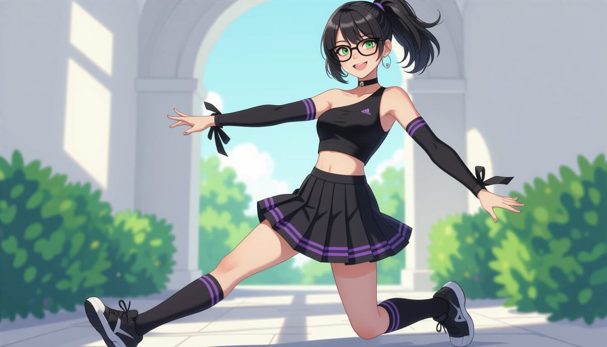 A studio portrait of Katerina Heiss with short black hair and emerald eyes. She wears a black crop top and tennis skirt with violet trim in a semi-anime style.