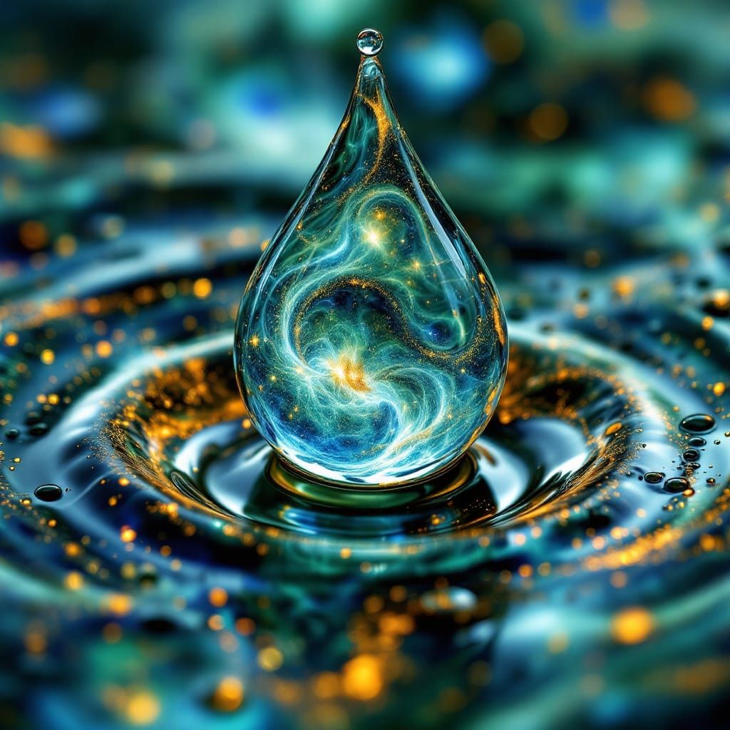 This image shows intricate fractal galaxies within a falling teardrop, captured in macro photography. It features extreme 3D effects and a sense of microscopic cosmic wonder with vibrant blues, greens, and gold.