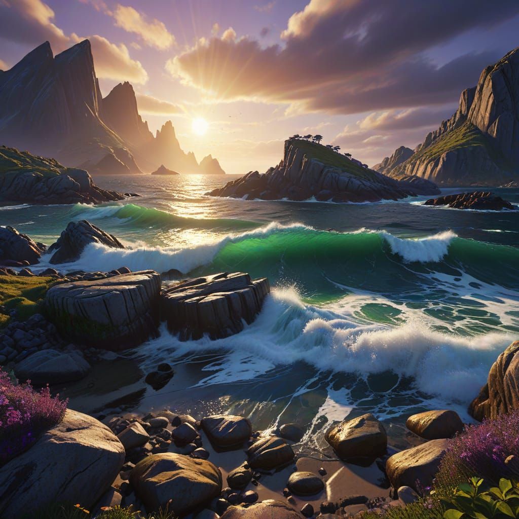A vibrant fantasy landscape depicting the island of Sommarøy bathed in the golden light of the midnight sun. The matte painting features deep shadows, complementary colors, and intricate details in a hyper-realistic style.
