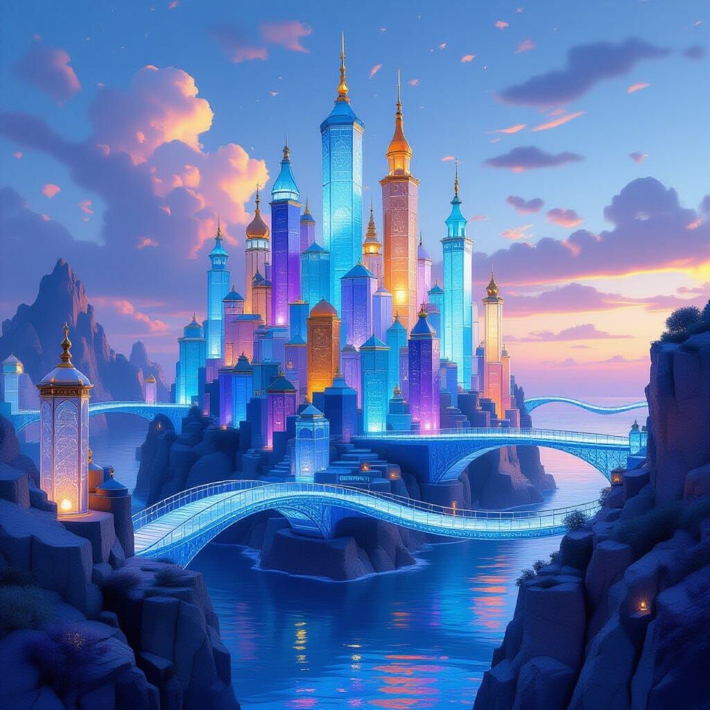 This image depicts a fantastical city built from colorful sea glass, with frosted glass bridges connecting shimmering towers. The metropolis glows with a delicate, luminous quality, evoking fantasy concept art.