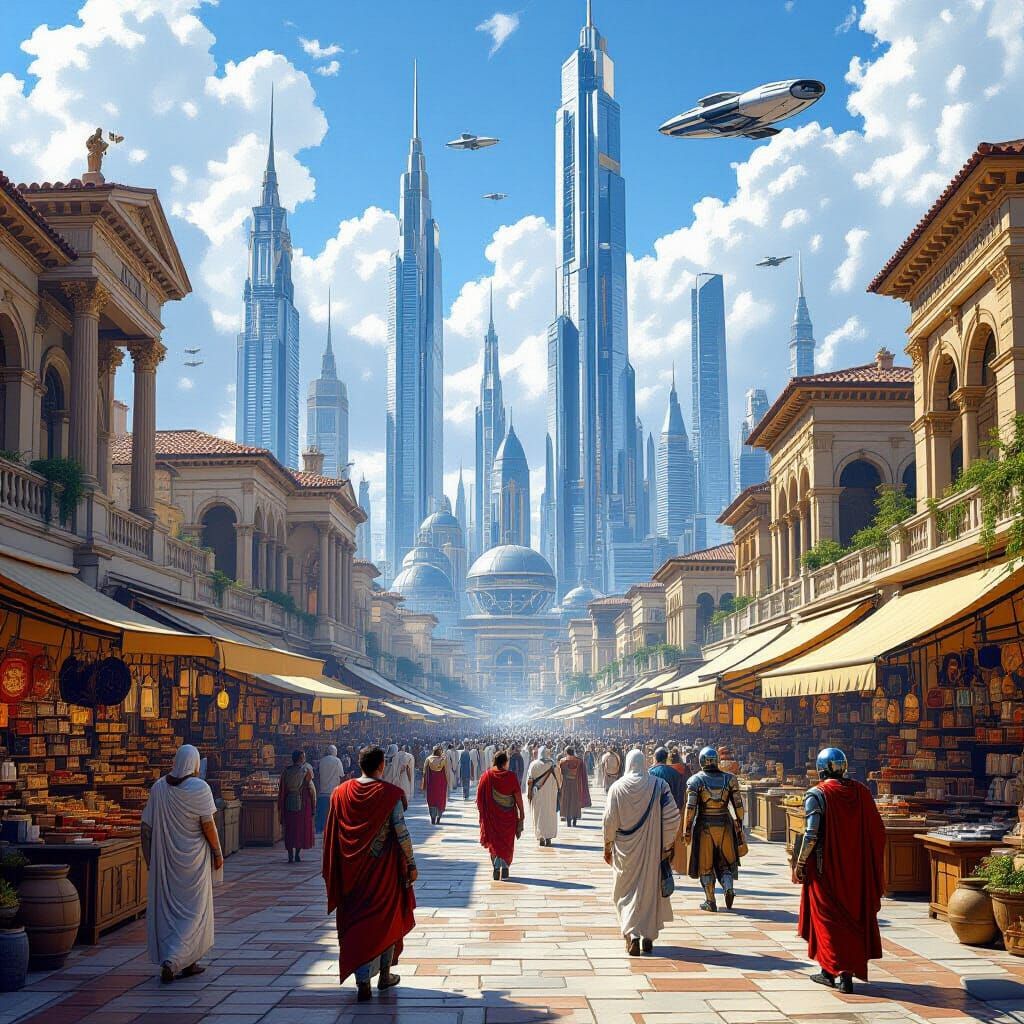 This image shows a Roman marketplace blended with futuristic skyscrapers. Citizens in togas interact with those in metallic attire, while flying vehicles traverse the sky in a Renaissance-inspired style.