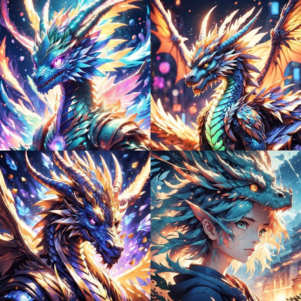 This image features a colorful, close-up portrait of a fantastical creature, blending fairy and dragon elements in a beautiful composition, with intricate details and a bright, radial gradient background, reminiscent of anime and concept art styles.