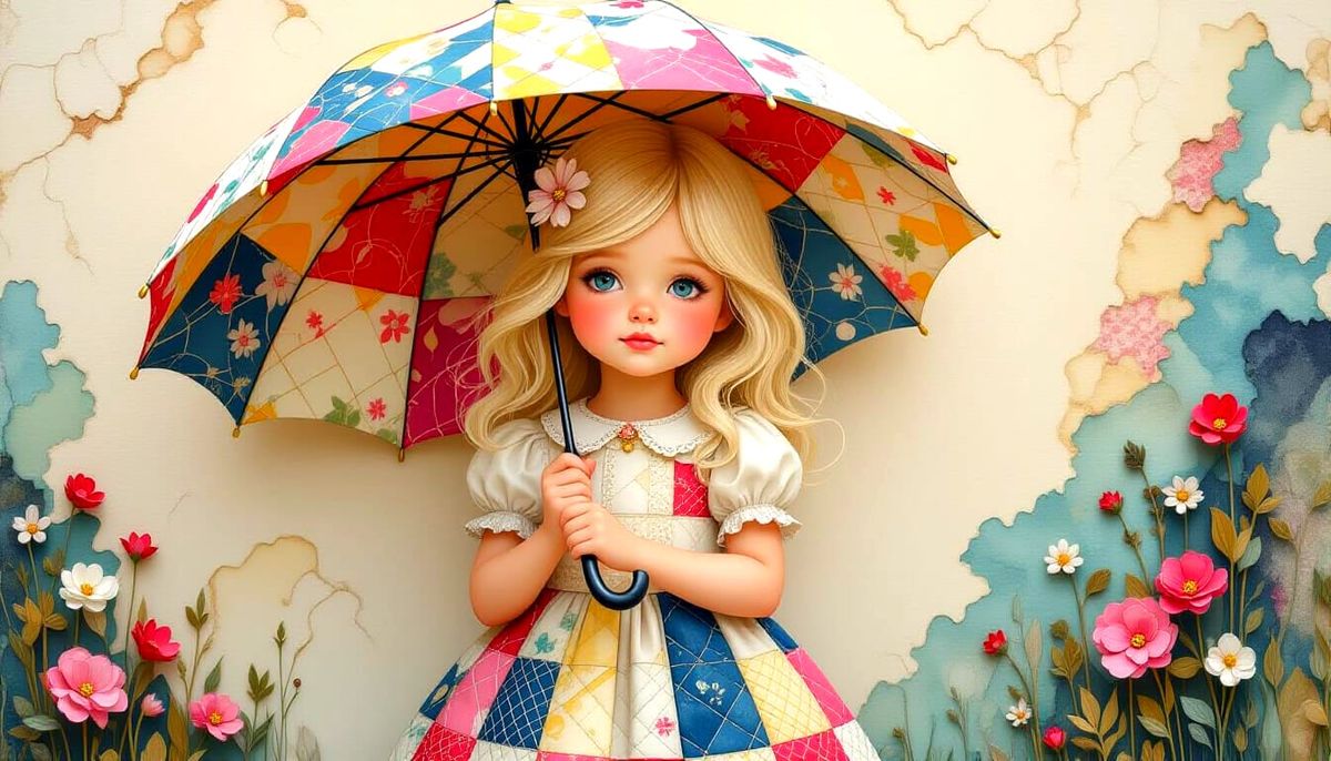 A stunning lblonde ittle girl portrayed entirely in a whimsical intricately detailed 3D illustration. She is wearing a stunning dress with quilted patchwork textures and flowing alcohol-ink patterns in rilievo, she has an open patchwork umbrella per ripararsi per della pioggia. The artwork blends soft ...
