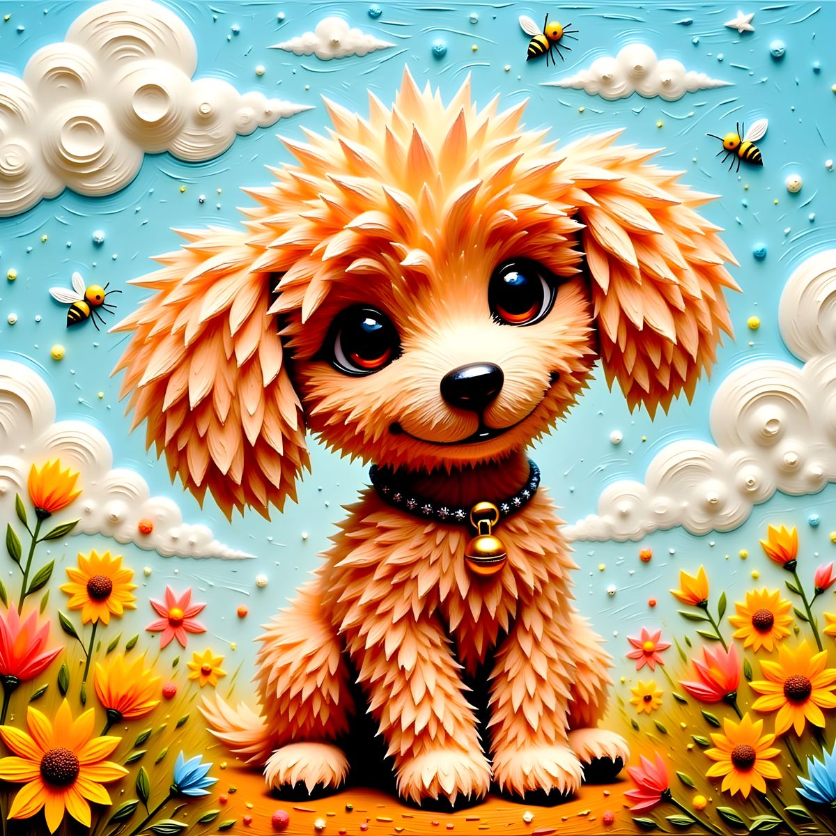 A charming picture of an adorable poodle puppy with colorful, textured fur and a tiny collar, posed playfully amongst flowers and buzzing bees. This artwork evokes a whimsical, folk art style.