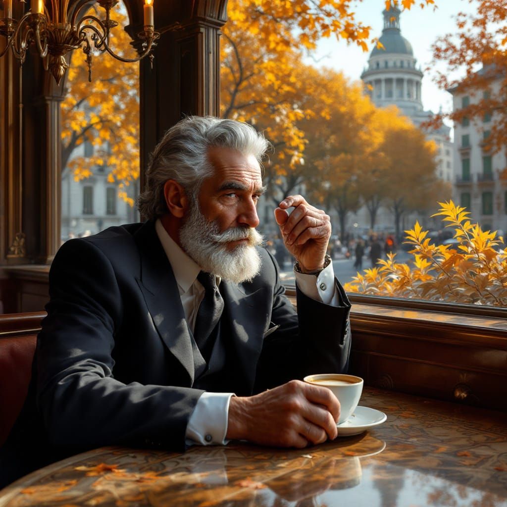 A digital painting captures an elegant Italian gentleman enjoying espresso in an Art Nouveau bar. Outside, an autumn cityscape bursts with amber, crimson, and honey hues. The artwork is in a dramatic, cinematic style.