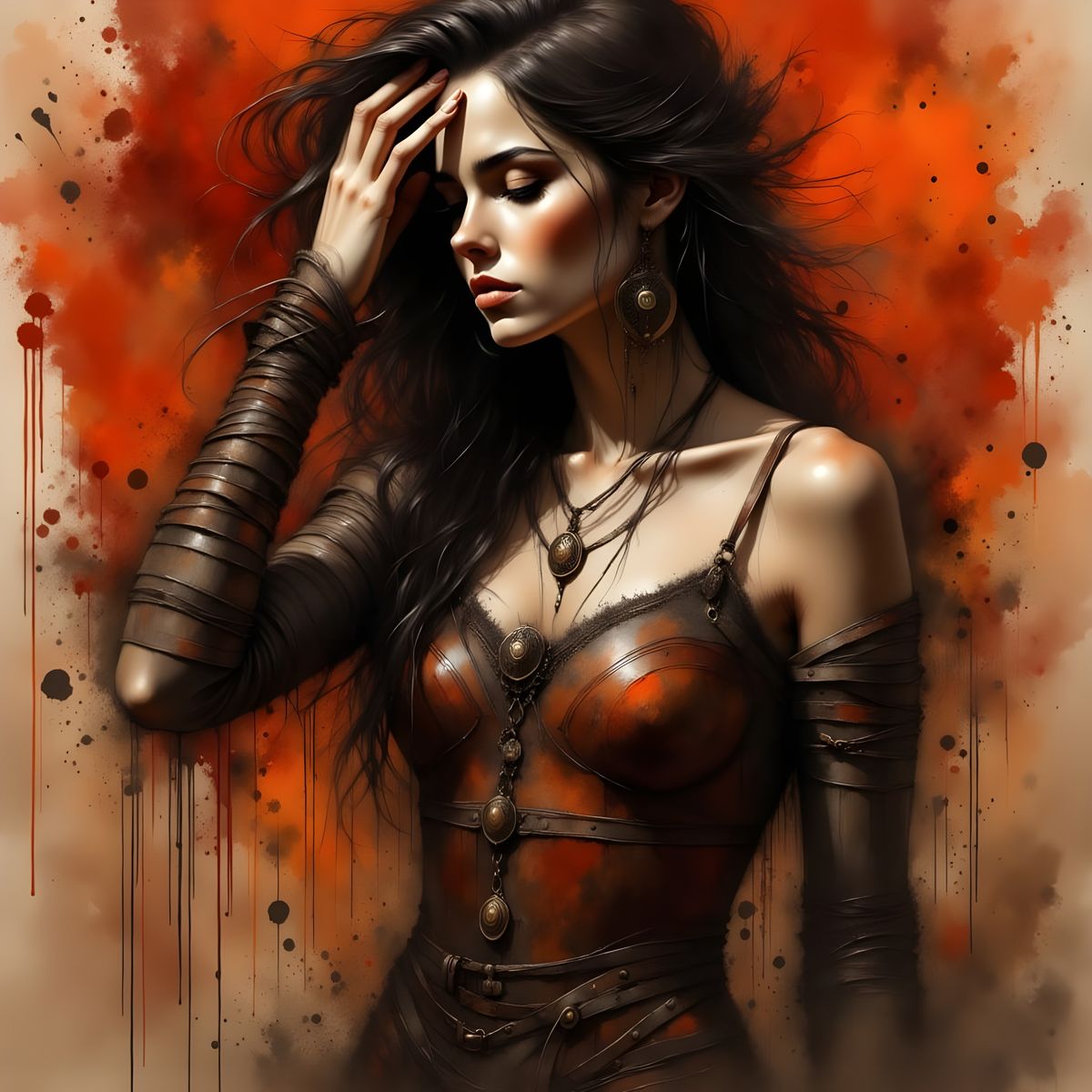 This image features a dichromatic portrait of a Norse goddess in dark brown and reddish-orange charcoal ink. She has dark hair, looks down sadly with a hand on her forehead, and wears a leather jerkin.