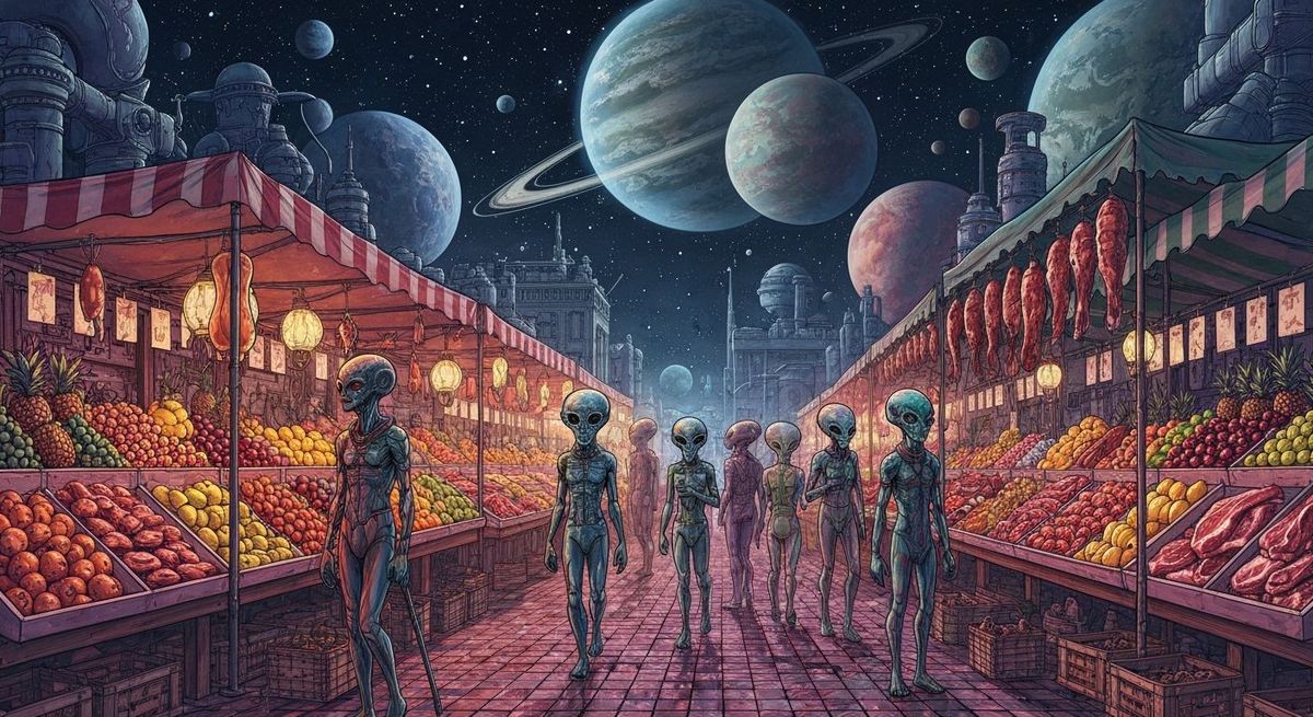 This image shows a vibrant alien night market scene. Exotic stalls display colorful fruits and meats under distant planets and stars, rendered with fluid lines and expressive brushstrokes in a maximalist, fantastical style.