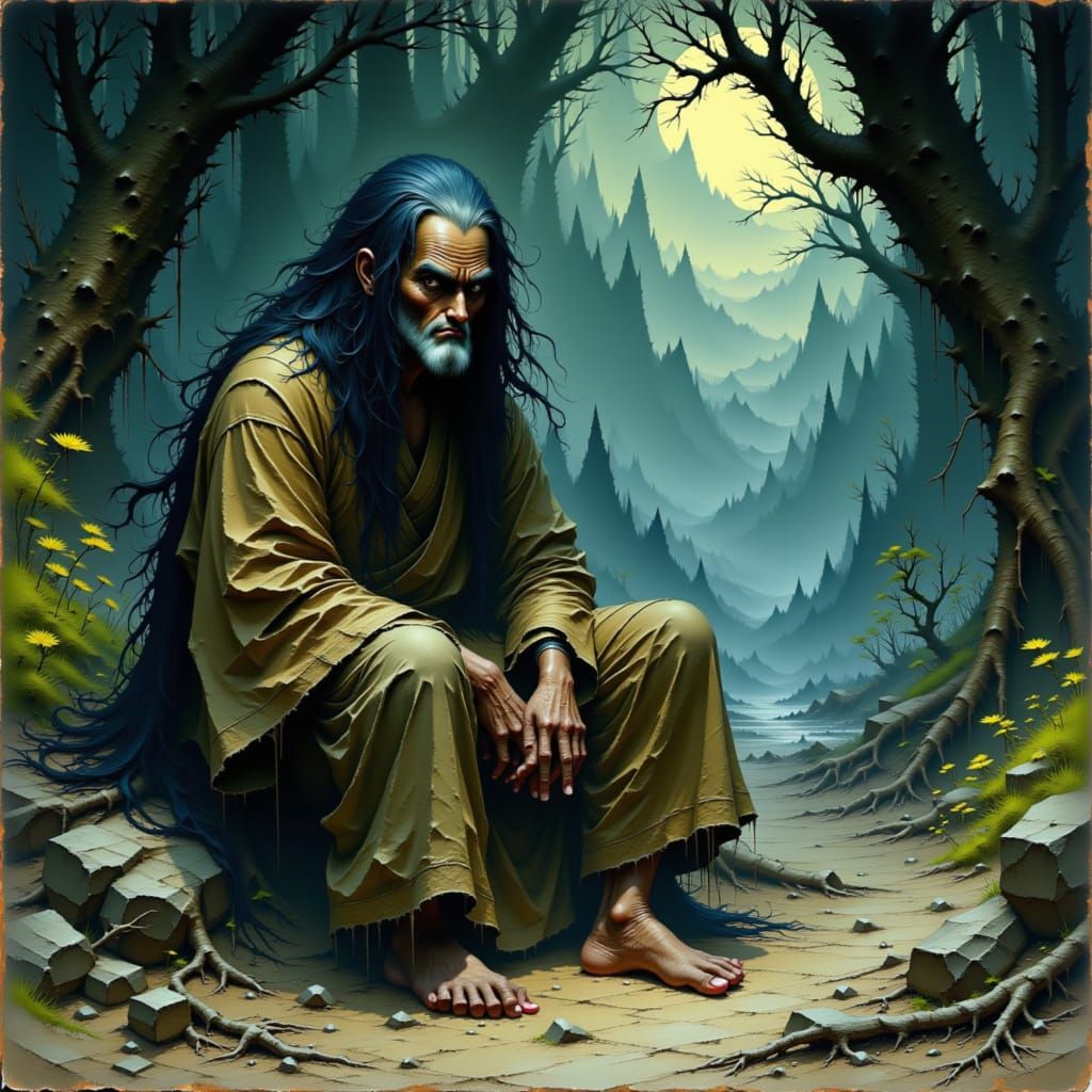 This image shows Yama-uba in a misty forest, her fierce gaze piercing through the scene. The artwork evokes a blend of traditional Japanese art with dark, muted colors, creating an eerie, mystical atmosphere.