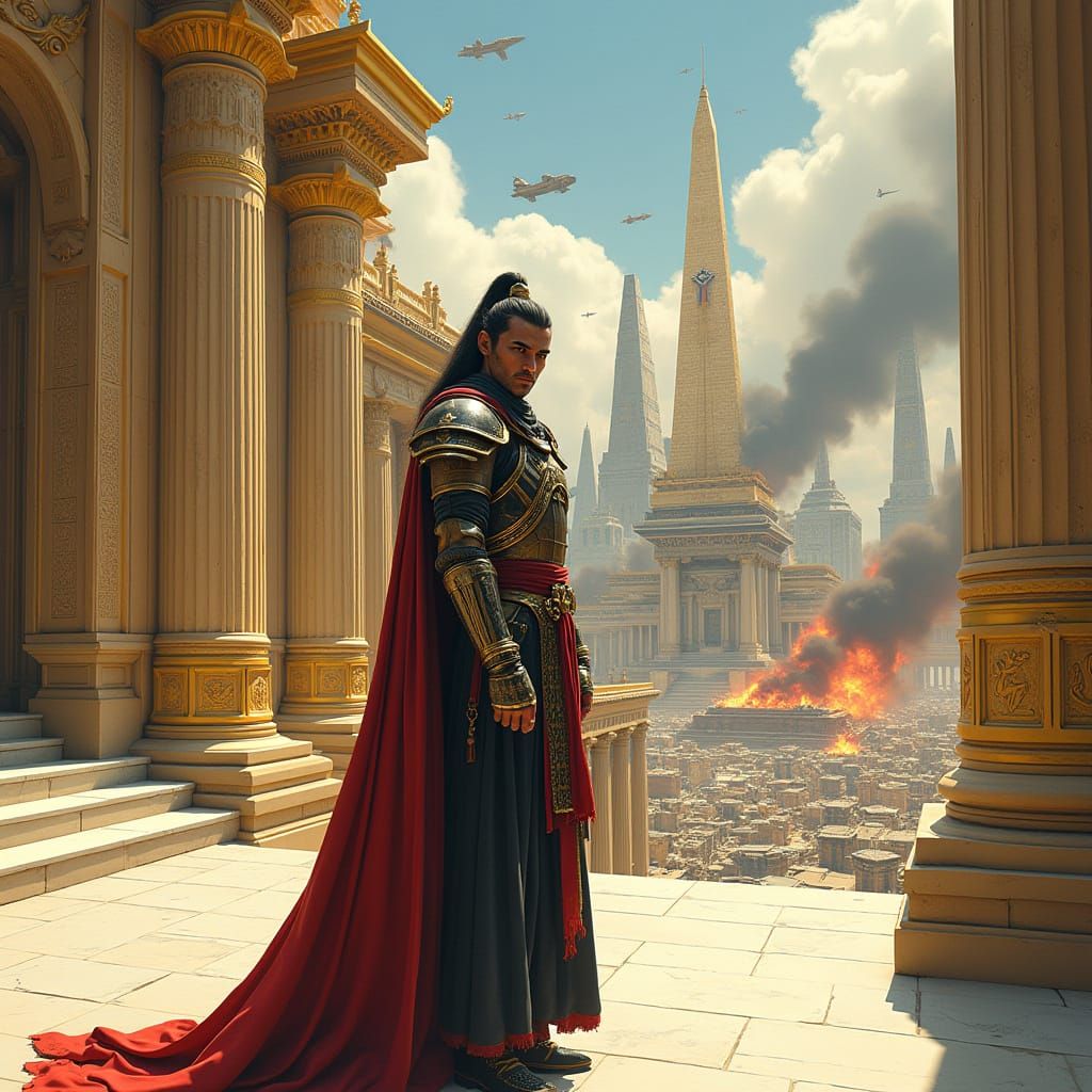 A digital painting in a Marvel comic style depicts En Sabah Nur in samurai armor on a palace terrace. A futuristic city with Egyptian and Japanese elements is under siege in the background. The scene is rendered with rich linework and warm tones.