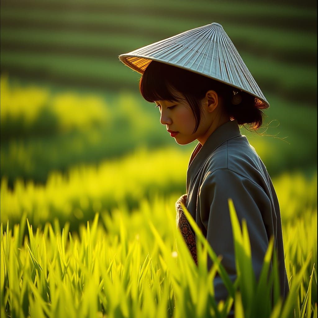 This image captures a young Japanese woman working in a lush rice paddy, rendered in a realistic, vintage cinematic style with warm, diffused light and a grainy film texture.