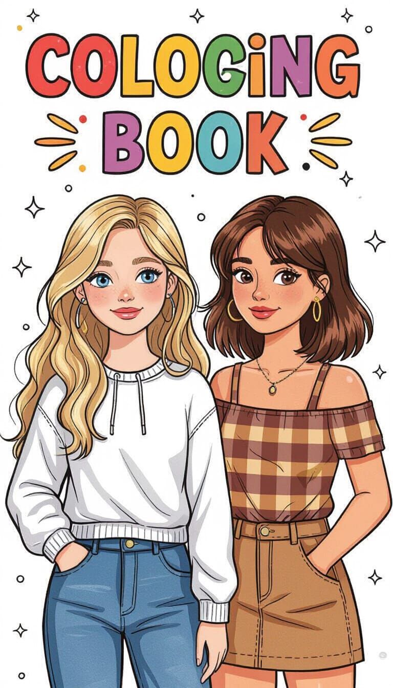 This image is a coloring book cover featuring two teenage girls, one blonde and one brunette, in bright, soft colors. It uses clear lines and simplified shapes, ideal for children's illustrations.