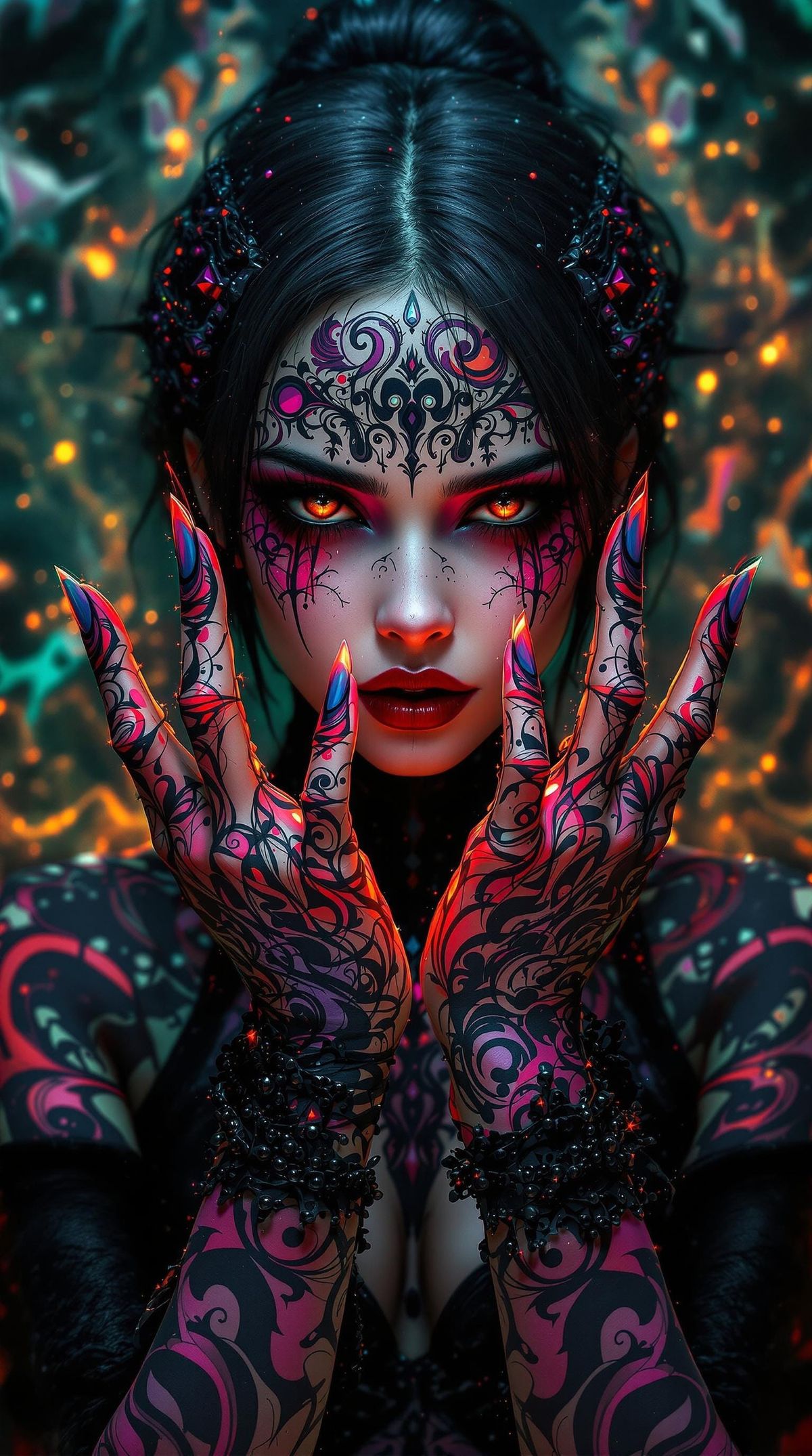 A dramatic portrait of a gothic girl with striking, abstract fantasy tattoos, posing in a high-contrast, cinematic setting with deep shadows and vibrant colors, evoking a sense of mysticism and wonder.