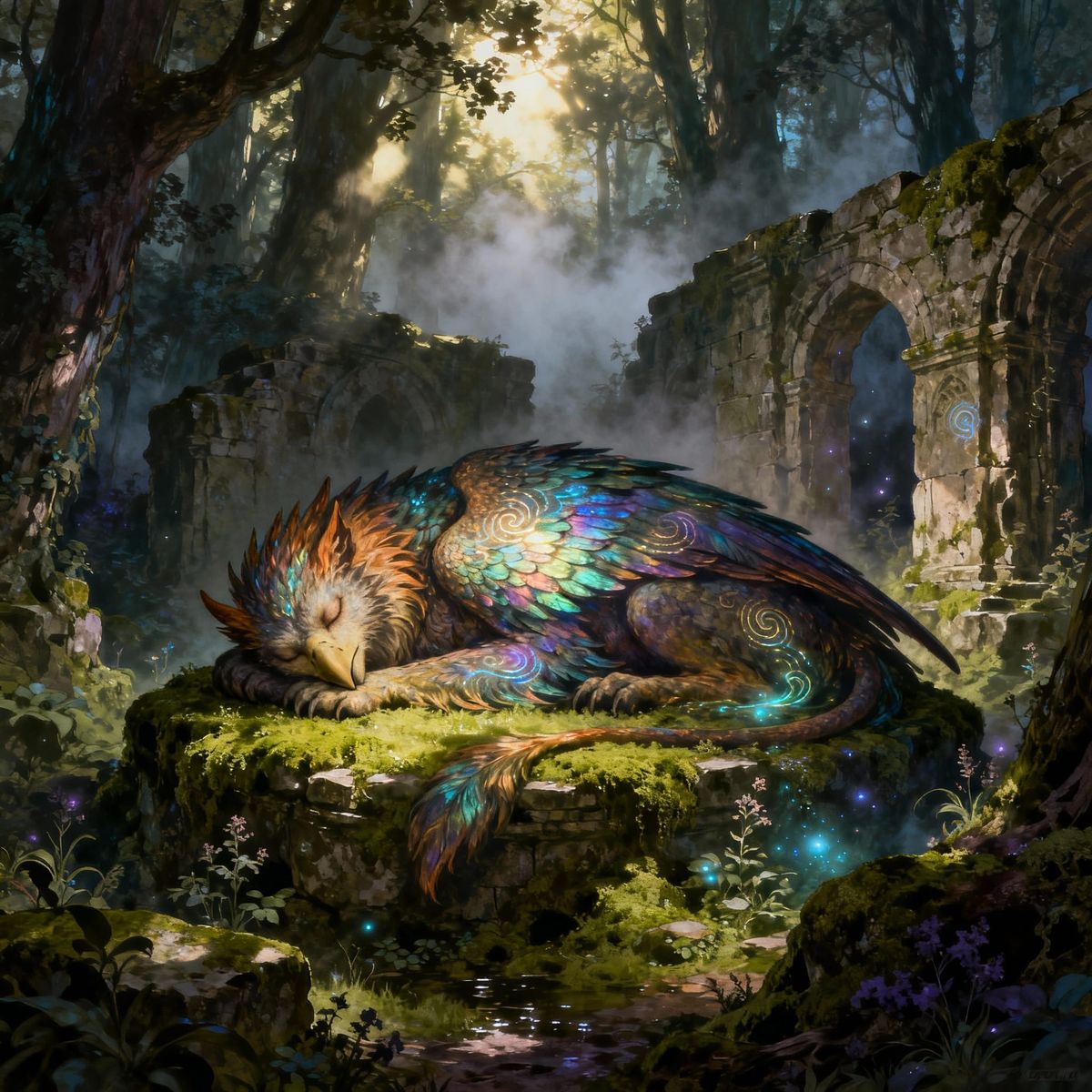 This image shows a majestic griffin asleep on moss-covered ancient ruins in an enchanted forest. Sunlight dapples its form, creating a tranquil scene in a painterly fantasy illustration style.
