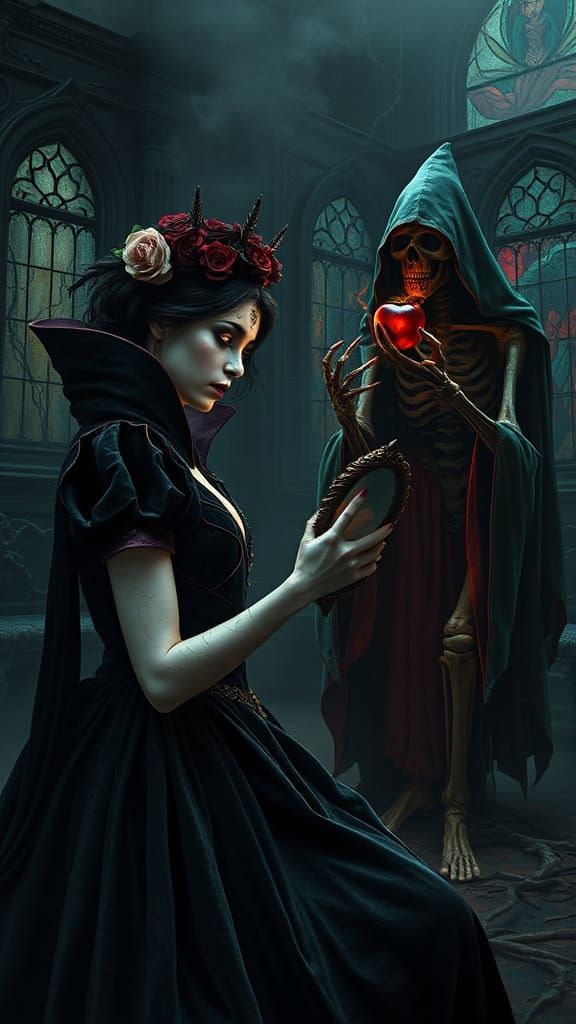 A haunting image of Snow White, corrupted and twisted, faces off against a dark sorceress in a decaying throne room, surrounded by dark magic and eerie lighting, reminiscent of gothic art and horror themes