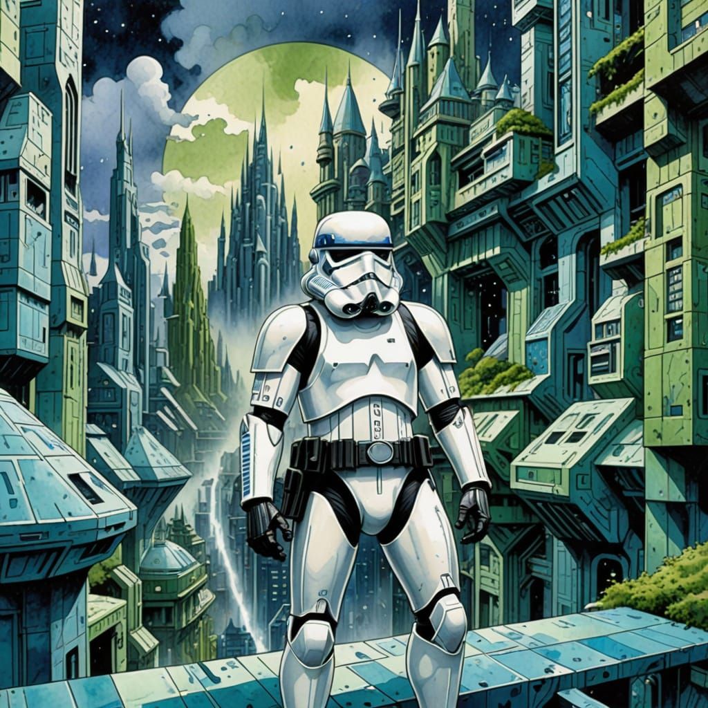 This image shows a stormtrooper in a futuristic city. The artwork features intricate architectural details and geometry, rendered in a watercolor comic book style with pastel indigo and mossy green hues. The image has a soft, muted lighting.