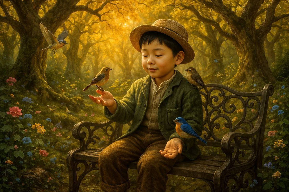This image shows a young boy seated on a wooden bench in an enchanted forest. Golden light filters through the autumn leaves, illuminating the scene. The artwork evokes a classic fairytale aesthetic.