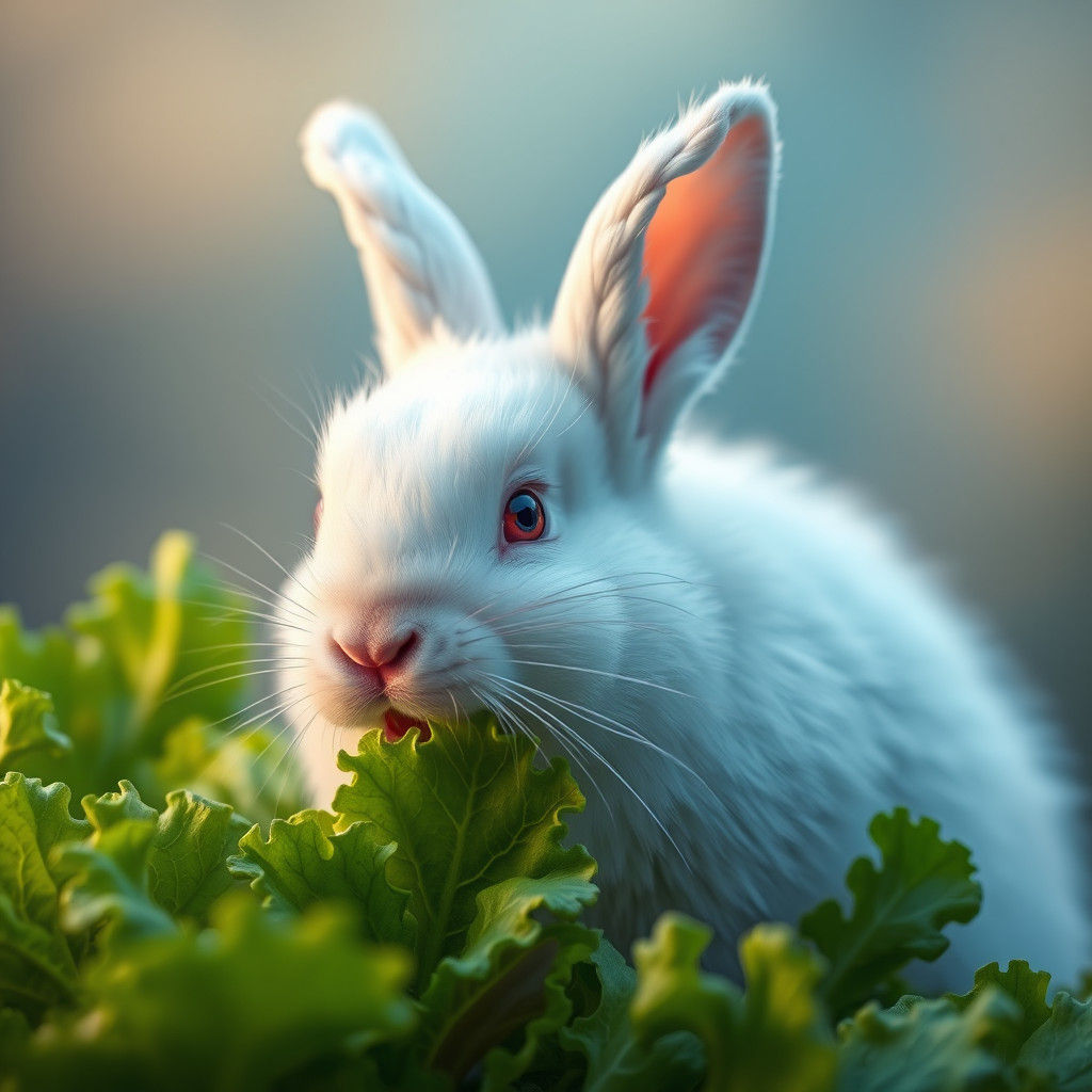 A photorealistic image of a white rabbit with red eyes eating lettuce. The artwork features intricate textures, subtle shading, and a rich color palette, reminiscent of fantasy concept art.