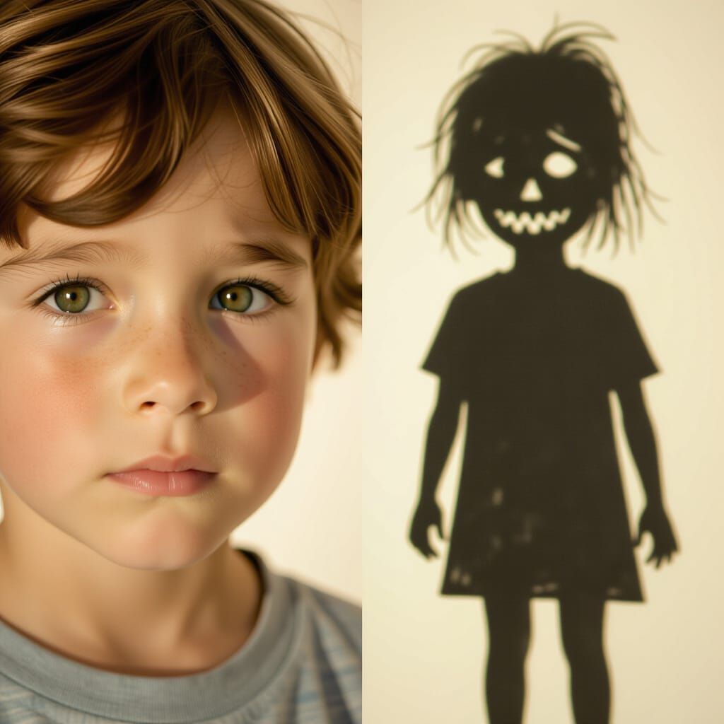 This image captures a child's face, with one side lit by a warm glow and the other in shadow, showing a tear. Cinematic lighting and shallow depth of field enhance the emotional contrast.