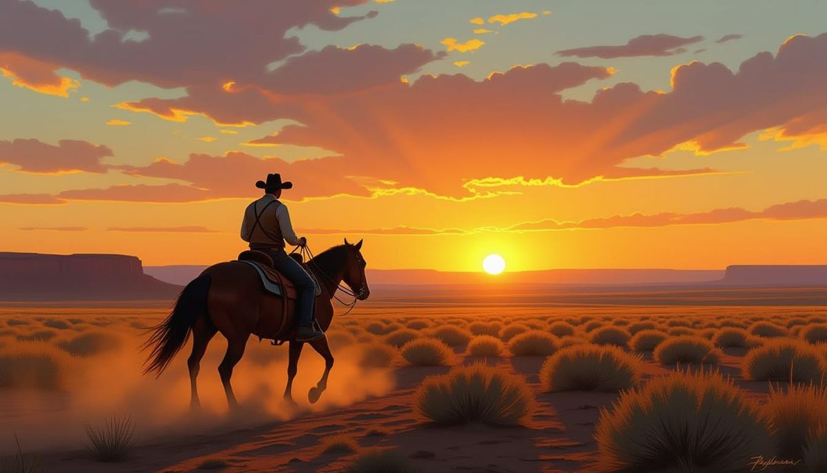 This image shows a lone cowboy on horseback riding through a dusty plain at sunset. The scene is depicted in a rich oil painting style with warm colors and golden hour lighting.