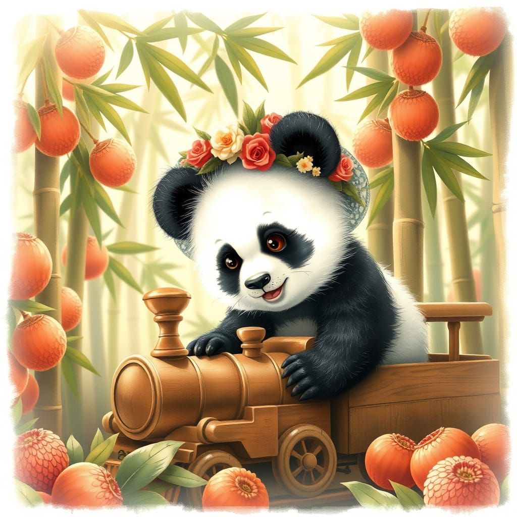 This image shows an adorable baby panda wearing a floral bonnet and playing with a vintage wooden toy train amidst giant lychees in a bamboo forest. The scene is rendered in a whimsical, pastel style.