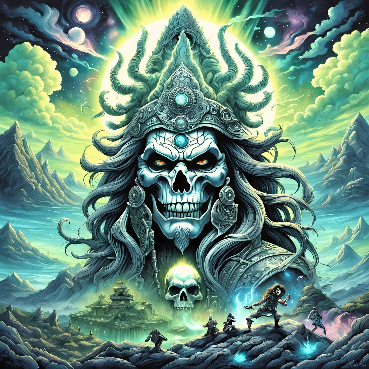 A surreal depiction of Lord Shiva in a cremation ground, infused with divine power. The artwork blends dark, mystical elements with steampunk and cosmic influences, creating a haunting and symbolic scene.