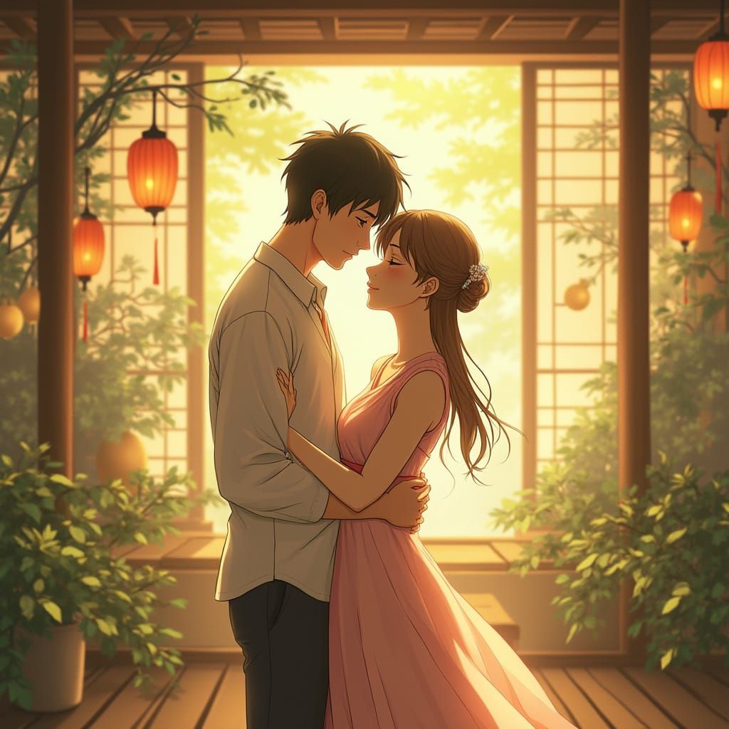 This image captures a tender moment between two people in a serene, golden-lit Japanese tea house setting, blending traditional and digital media with intricate textures and lush greenery, reminiscent of Studio Ghibli's whimsical and detailed world.