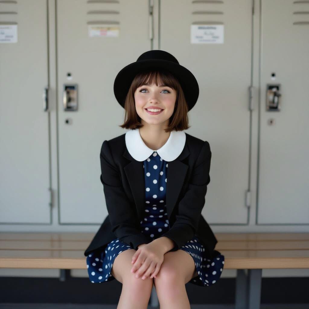 This image shows a pretty 16-year-old French girl sitting on a bench in a school hallway. She has blue eyes, a bob haircut and is smiling, wearing a polka dot dress and black jacket. The shot is in a naturalistic style.