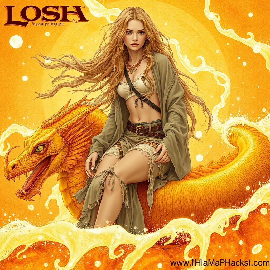 This image depicts a serene woman with golden hair on a giant gummy dragon, floating in a bubbly soda sea with warm amber and tangerine tones. Features intricate patterns and a blend of art nouveau and fantasy realism styles.