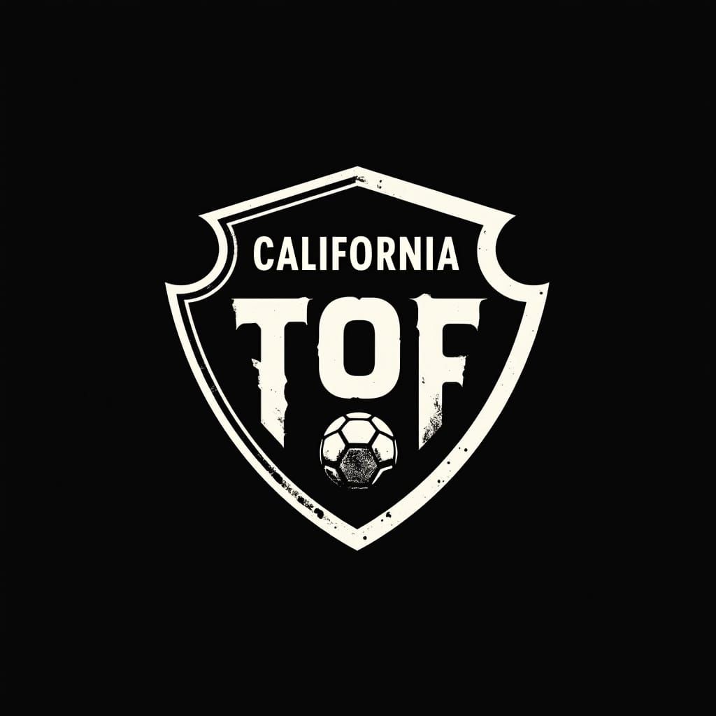 A retro sports logo for a California foosball team. The white emblem on a black background features a shield design, creating a vintage athletic aesthetic in a bold style.