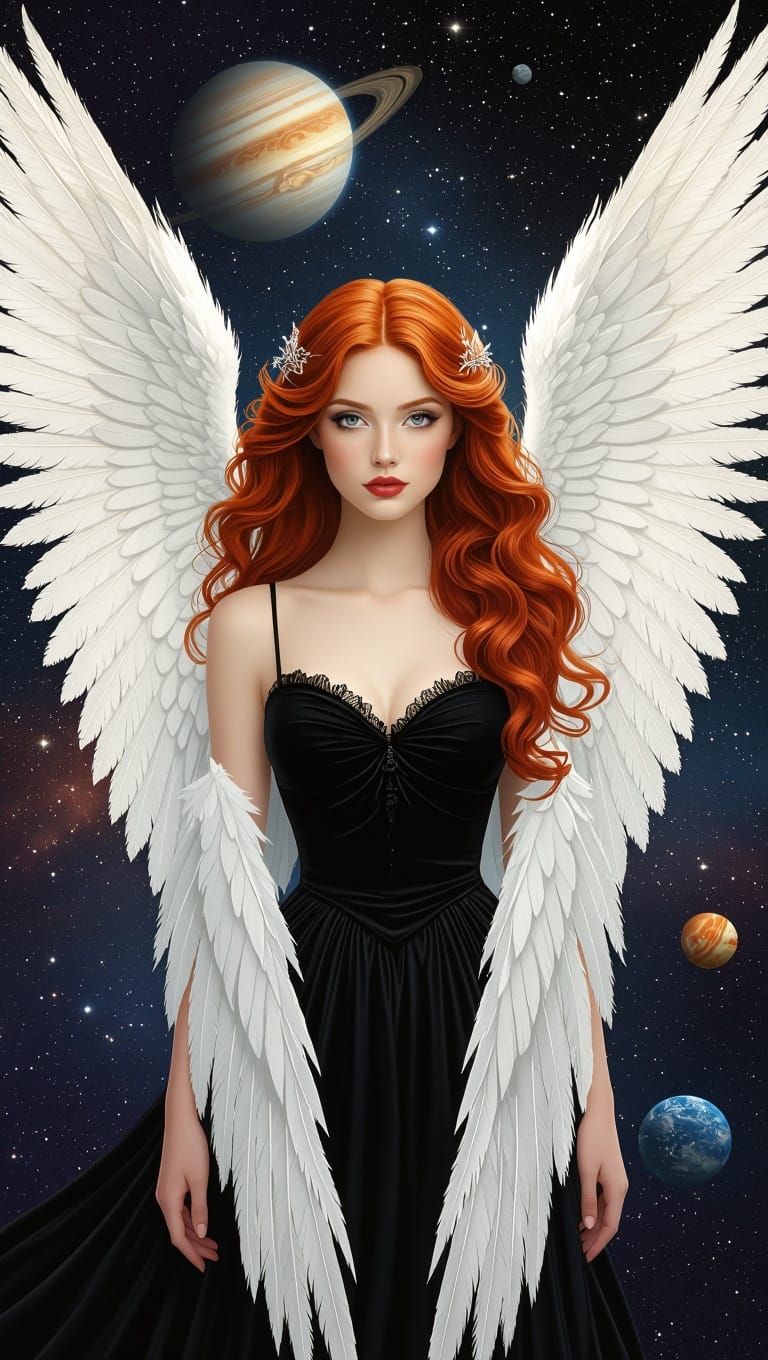 This image shows a stunning red-haired angel with striking eyes and majestic wings, set against a celestial backdrop of stars and planets, evoking a fairytale atmosphere.