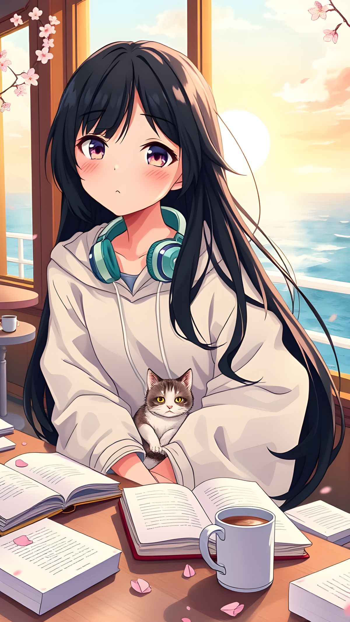 A peaceful anime girl sits in a seaside café, surrounded by books, coffee mugs, and a soft-furred cat, as cherry blossoms mingle with sea spray in a Ghibli-inspired scene of LoFi serenity.