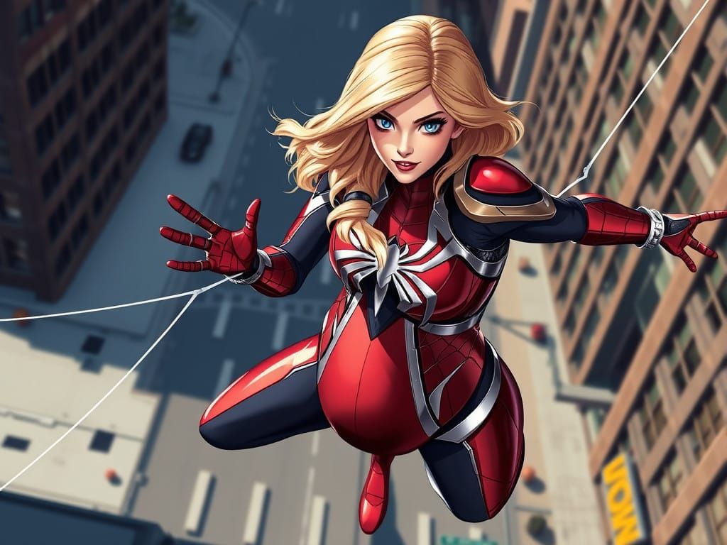 This image shows a pregnant superheroine in Ironman armor, flying above a New York street, with a beautiful blonde face and web-shooters on her wrist.