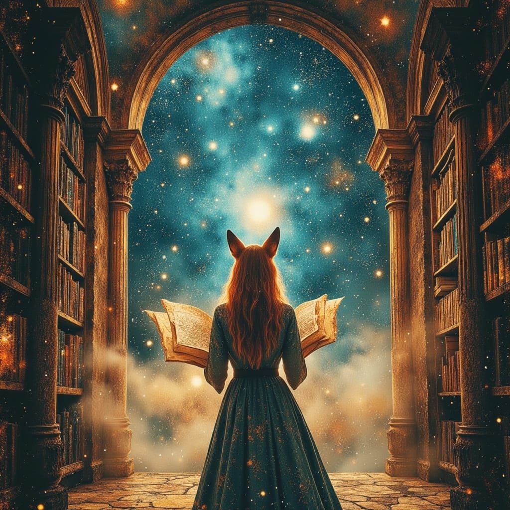 This image depicts a divine woman charting unknown space with maps of light. She is in an interdimensional library filled with glowing books. Rendered in a cosmic surrealist airbrush style.