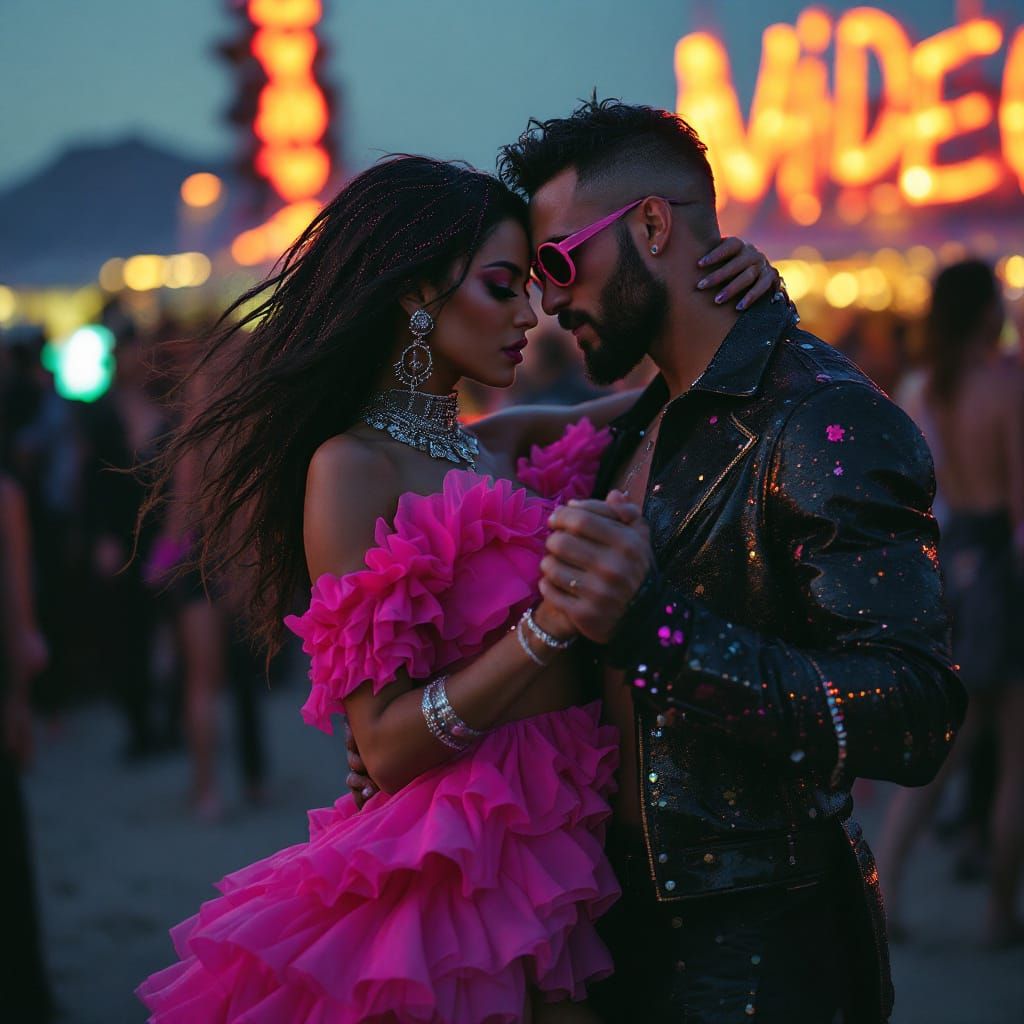 This image depicts a vibrant desert festival scene, reimagining Cinderella's ball with a modern rave aesthetic. It features a dancer in a sequined outfit and a man in edgy attire, captured in a moment of intimate, energetic dance under a twilight sky.