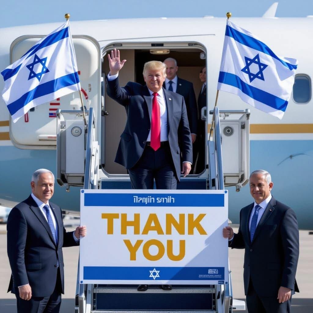 This image shows Donald Trump descending an airplane ramp, waving in greeting. Israeli and US flags fly behind him as Prime Minister Netanyahu and his aide hold a "Thank You" sign.