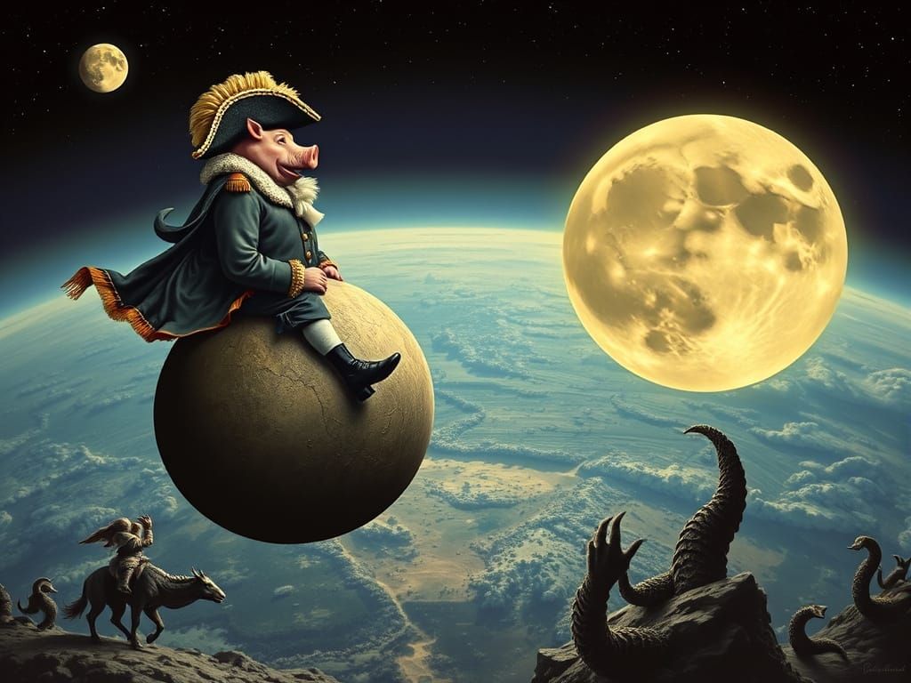 A surreal image shows an 18th-century general with a pig's head riding a cannonball toward the moon. The artwork evokes a fantastical and eerie atmosphere with dreamlike elements.