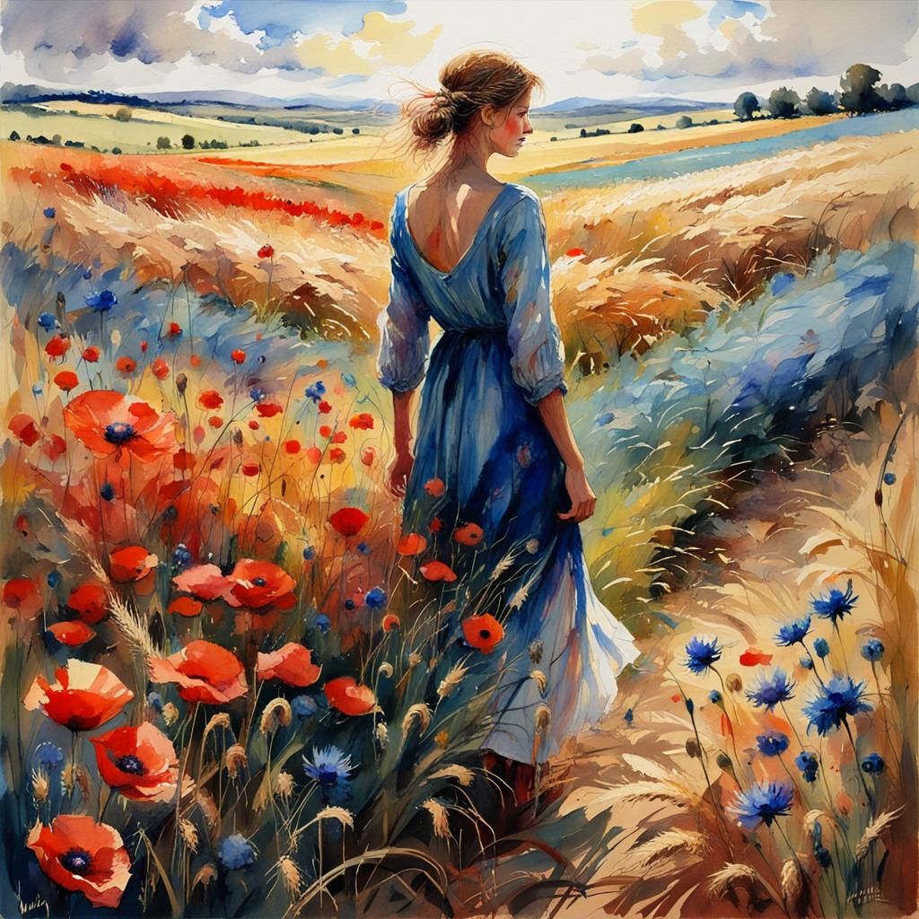 A watercolor landscape of a wheat field with poppies and cornflowers. The vibrant painting of a walking woman in a field uses soft pastels and bright, sunny colors to create a romantic and elegant scene.