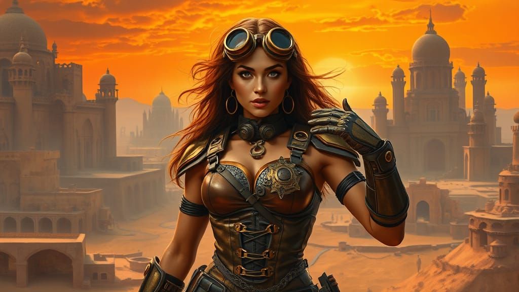 A striking image of a tan female superhero in a steampunk costume, standing heroically in a desert city with ancient, crumbling buildings and majestic sandstone structures, set against a deep, fiery orange sky with hues of crimson and gold, created in a detailed matte painting style
