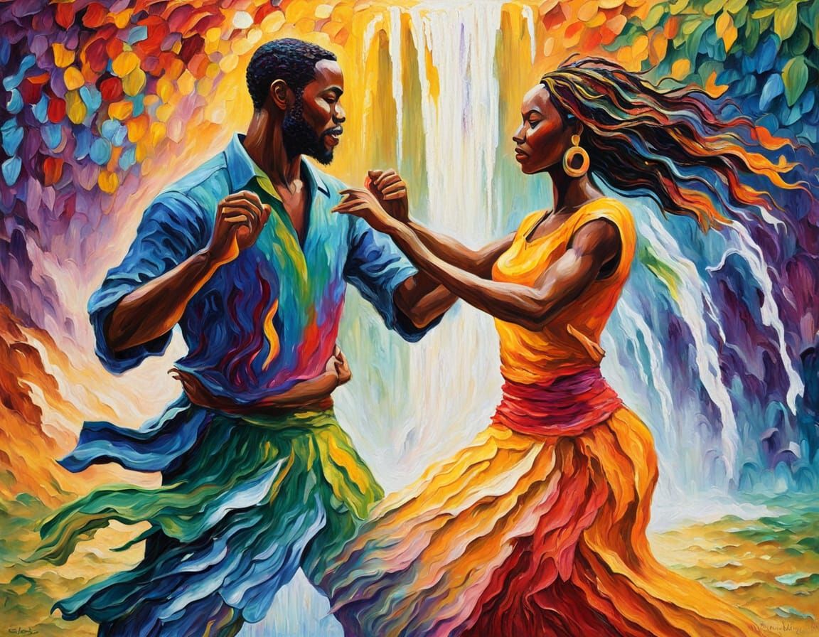 A vibrant impasto painting of an African American couple dancing beneath a waterfall. The artwork uses bold brushstrokes and a warm color palette to capture a sense of soulful harmony.