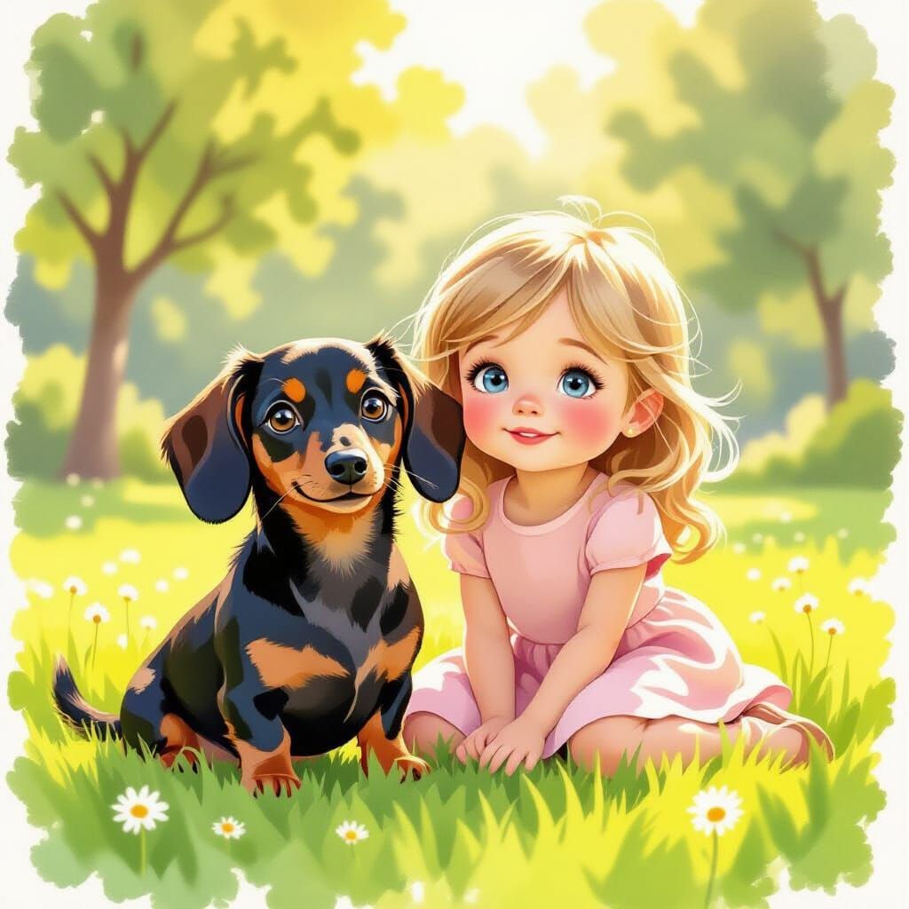 This image shows a charming watercolor illustration of a black and tan dachshund sitting with a blonde-haired girl in a sunny park. Gentle brushstrokes and warm colors evoke a nostalgic, golden hour atmosphere.