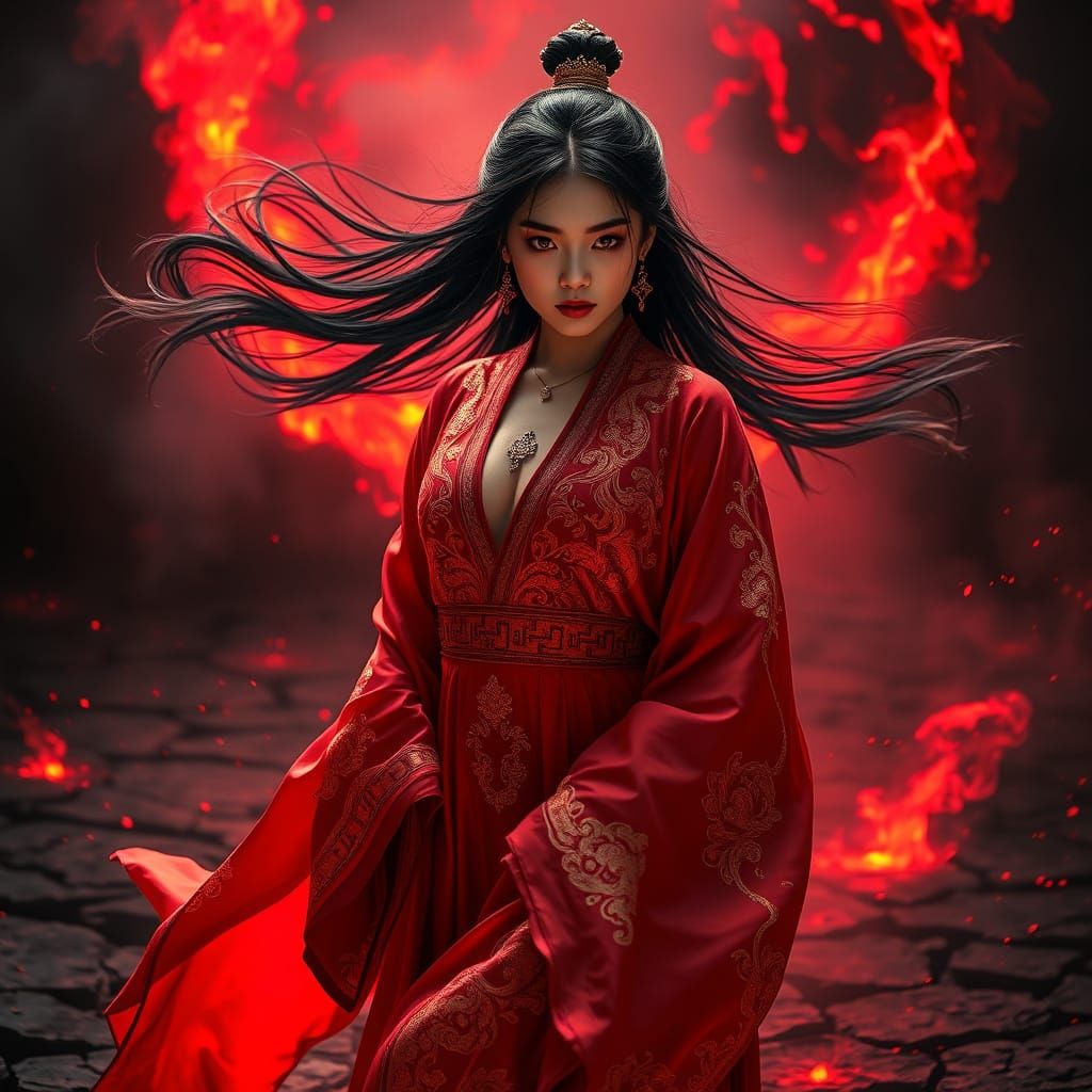 This image shows a powerful young woman in an ancient Chinese silk dress, surrounded by a demonic aura. Red light glows from cracked ground, smoke swirls, and embers float in this hyperrealistic 8K portrait.