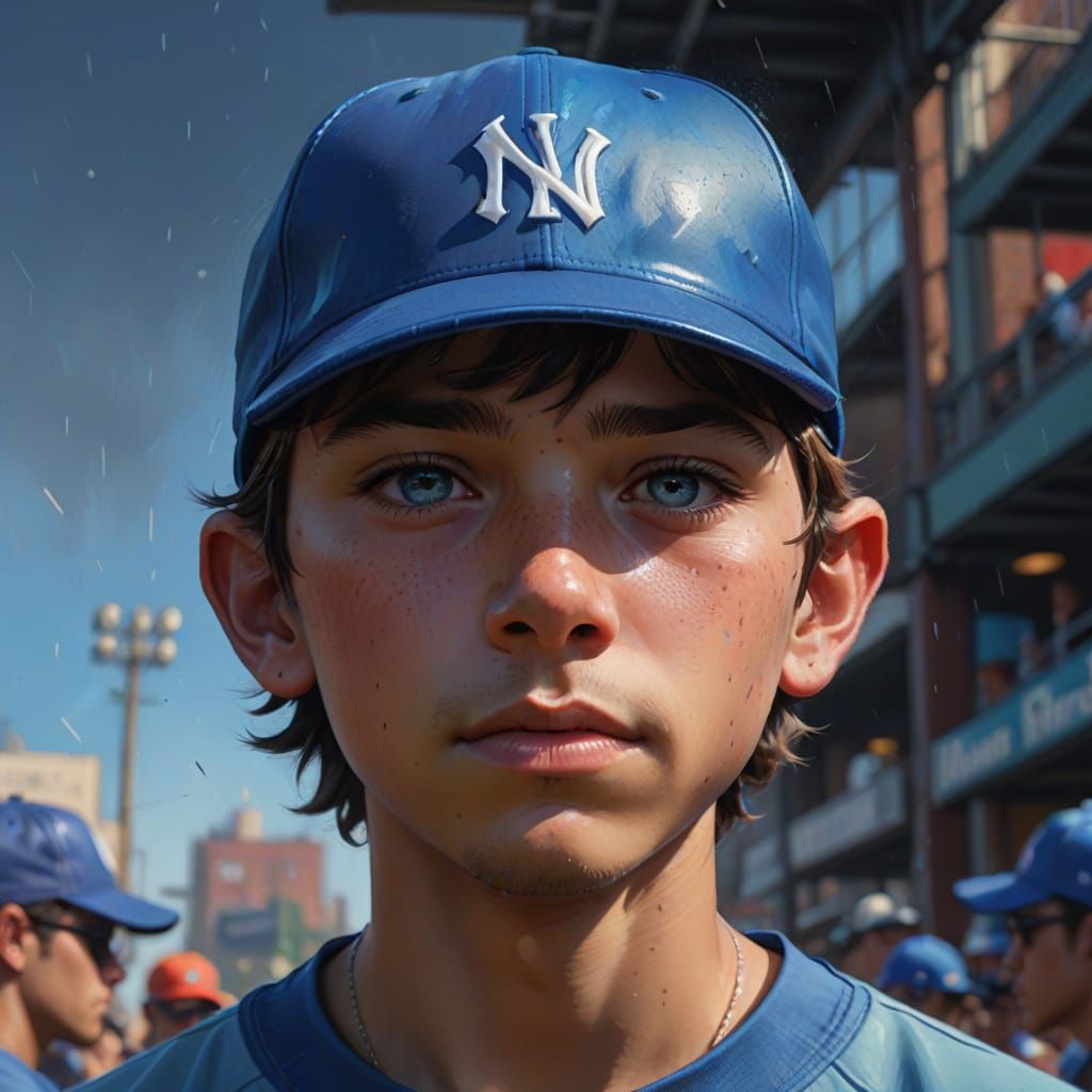 This digital painting showcases a young boy wearing a blue baseball hat and shirt. The portrait features soft, dynamic lighting and vibrant colors, rendered in a hyperdetailed, trending art style.