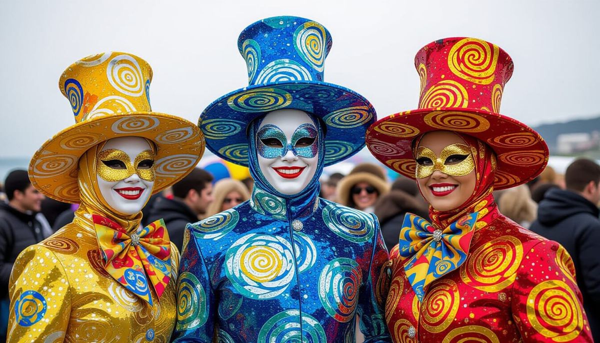 A costume festival at a beach celebration for celebrating “van gogh swirl Mask Month” where groups of people wears elaborate disguises, vibrant swirl Van Gogh glitter costume, giant van gogh swirl pattern hats, By Jeff soto, prismatic glass, Monet's pattern, Van Gogh clouds, Leonid Afremov flowers, ...