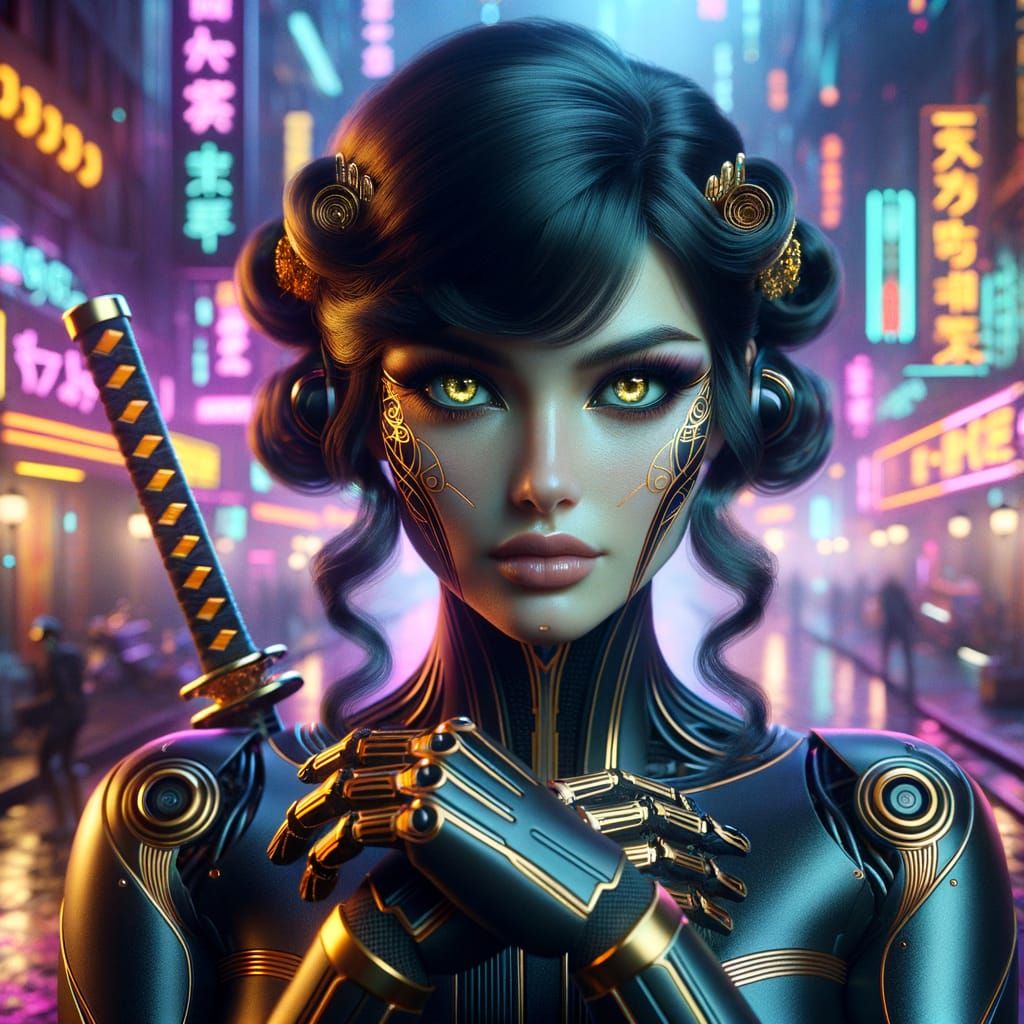 This image captures a striking female cyborg in a futuristic cityscape, with neon lights and dark, gritty aesthetic. She's a confident mercenary, with cybernetic implants and a sleek black jumpsuit, posing with a katana and a robotic arm, set against a backdrop of vibrant city lights.